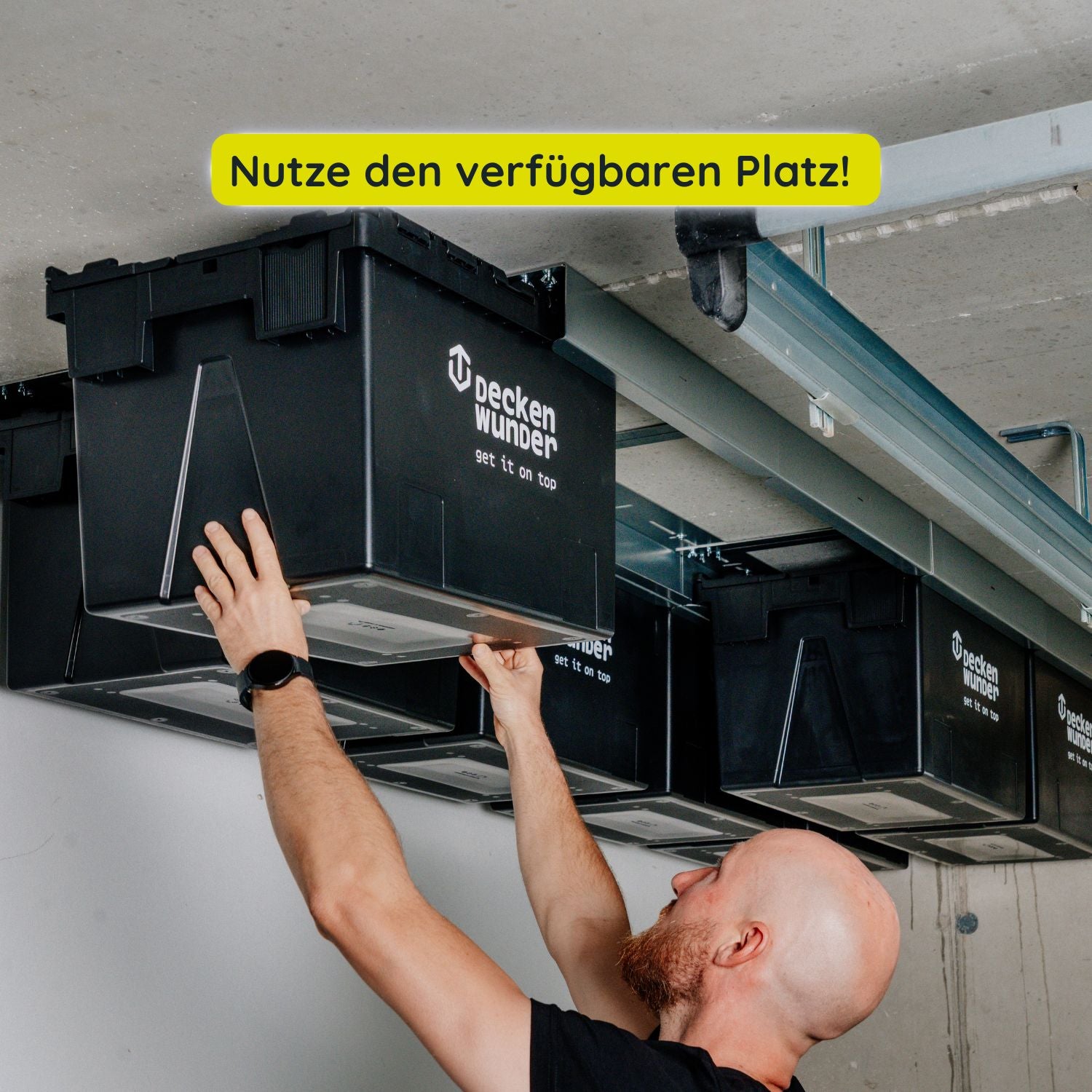 Unsere hochwertigen Storage-Boxen gemeinsam mit den Schienen aus robustem Industriestahl sind speziell für die effiziente Raumnutzung entwickelt worden. Sie sind nicht nur langlebig, sondern auch einfach zu installieren. Vielseitig einsetzbar in Garagen, Kellern, Gartenhütten und auf Dachböden, bieten sie eine optimale Lösung für jeden Raum. Zufriedene Kundenbewertungen sprechen für sich – entdecke selbst, wie Deckenwunder deinen Stauraum revolutionieren kann.