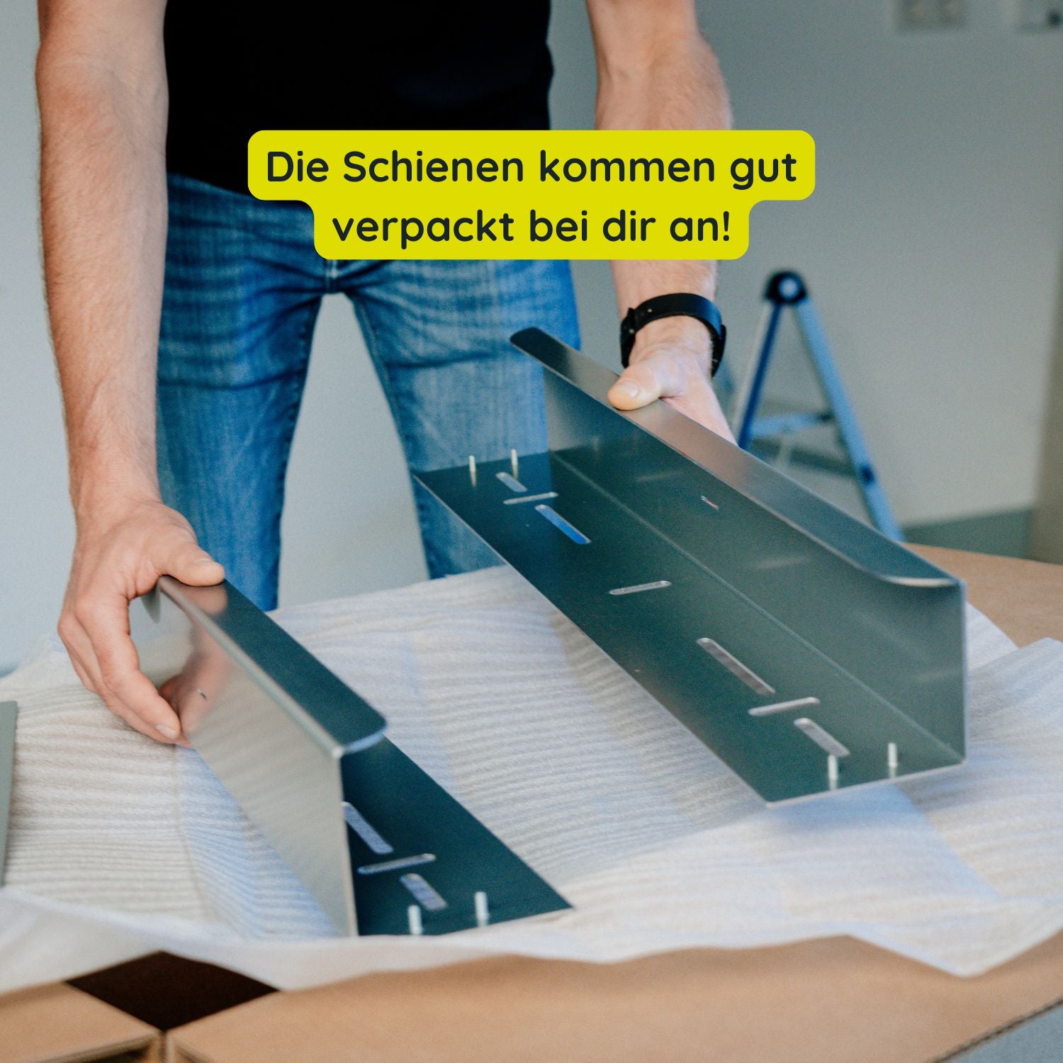 Unsere Boxen und Schienen sind so produziert, dass sie einfach und schnell montiert werden können. Du benötigst für die Montage lediglich einen Bohrer und das passende Befestigungsmaterial wie Schrauben und Dübel. Eine Anleitung und eine Schablone liegen natürlich dem Paket bei.